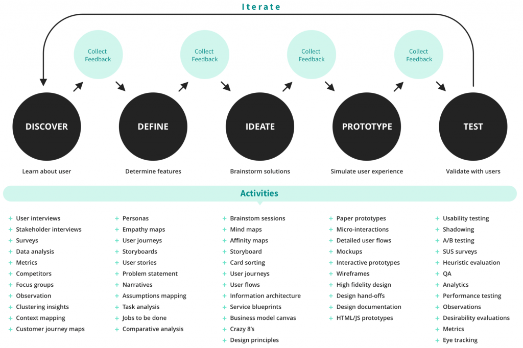 I follow a basic process involving five phases (discover, define, ideate, prototype and test) which is an iterative process that helps me to understand users, challenge assumptions, and create innovative solutions.
