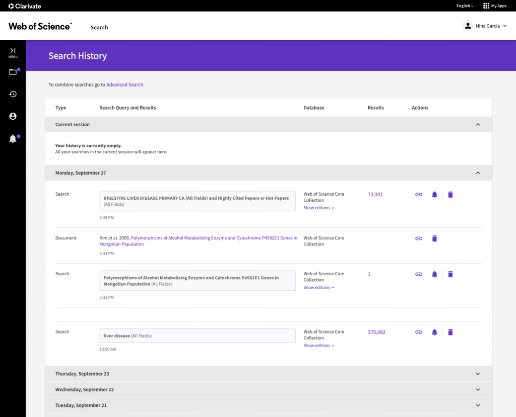 We are adding a persistent left navigation, which will house and draw attention to the personalized features, including the profile. The team is adding additional functionality to the researcher profile in WoS – users can add, delete and manage publications, peer review, grant reviews and editor records, as well as their name and bio information.